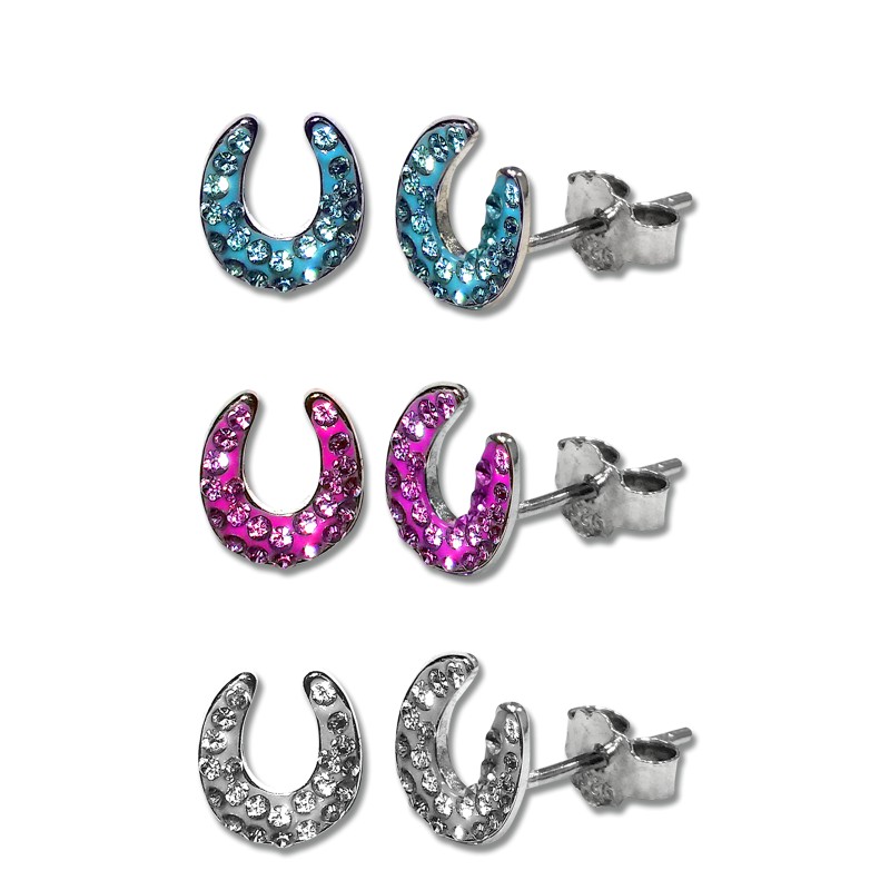 Enchanting earrings in horseshoe design. 925 sterling silver, set with sparkling zirconia stones in blue, pink or silver. Pair NOTE: Not suitable for children under 3 years. Danger of choking due to small pieces that could be swallowed. Dimensions: approx. 9 mm x 9 mm